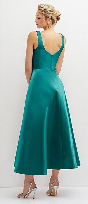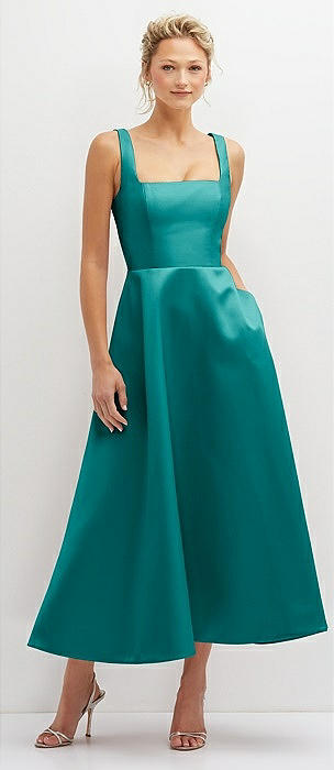 Square Neck Satin Midi Dress with Full Skirt & Pockets