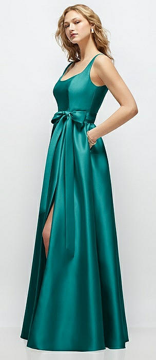 Scoop Neck Drop Basque Skirt Satin Maxi Dress with Pockets in jade