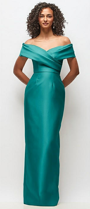 Off-the-Shoulder Draped Wrap Satin Maxi Dress in jade