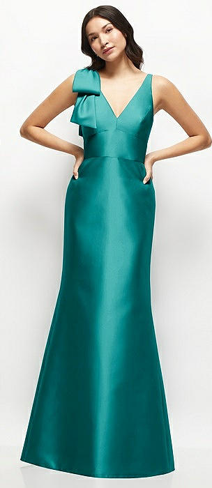 Deep V-back Satin Trumpet Dress with Cascading Bow at One Shoulder in jade
