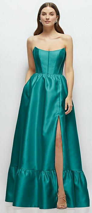 Strapless Cat-Eye Boned Bodice Maxi Dress with Ruffle Hem in jade