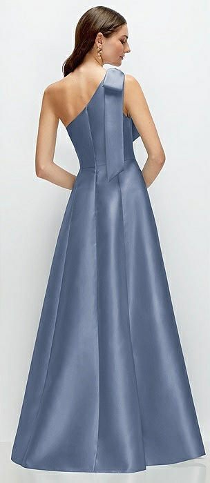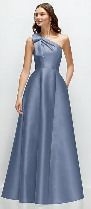 Bow One-Shoulder Full A-Line Satin Maxi Dress in larkspur blue