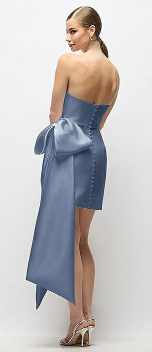 Strapless Pleated Draped Satin Mini Dress with Dramatic Long Tail Bow & Covered Buttons in larkspur blue