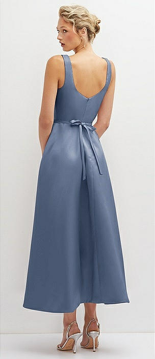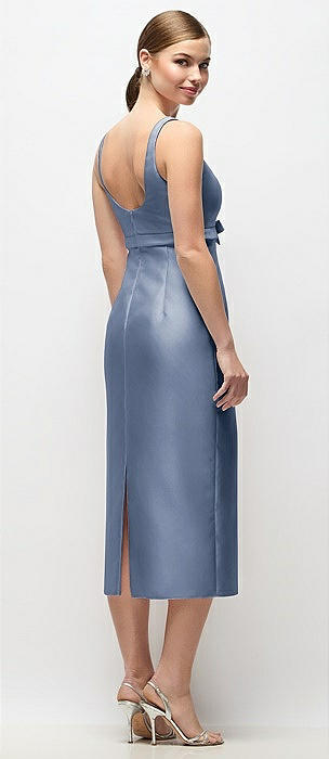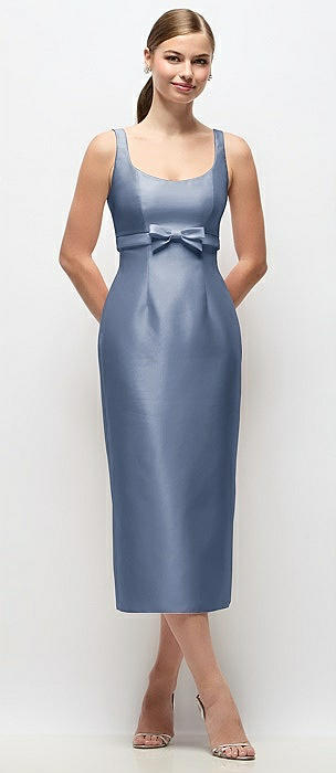 Scoop Neck Satin Column Midi Dress with Bow at Empire Waist in larkspur blue