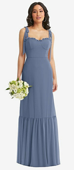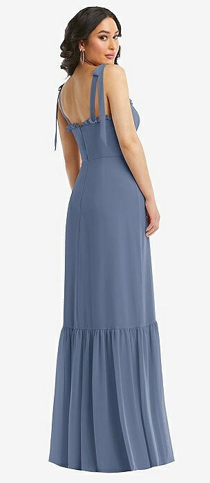 Tie-Shoulder Bustier Bodice Ruffle-Hem Maxi Dress in larkspur blue