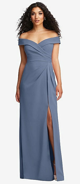Cuffed Off-the-Shoulder Pleated Faux Wrap Maxi Dress in larkspur blue