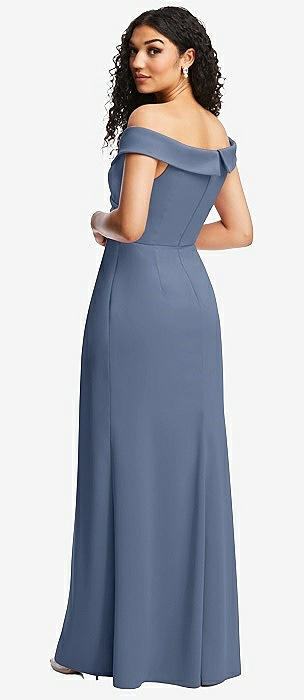 Off-the-Shoulder Criss Cross Back Trumpet Gown in larkspur blue