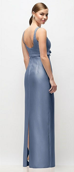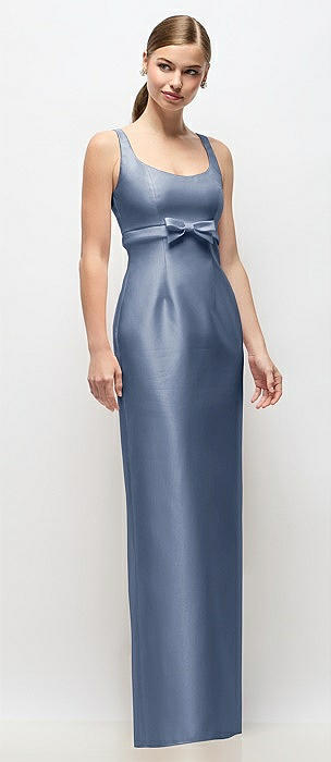 Scoop Neck Satin Column Maxi Dress with Bow at Empire Waist in larkspur blue