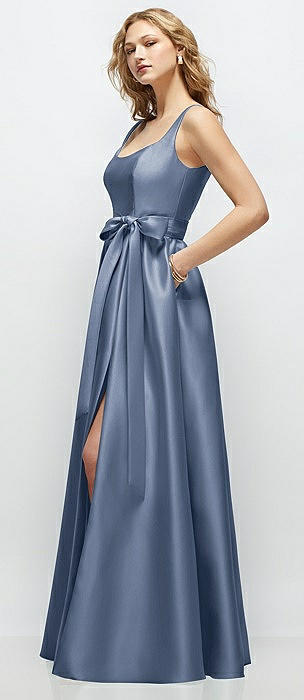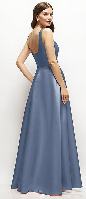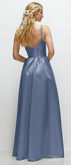 Scoop Neck Inset Corset Satin Maxi Dress with Pockets in larkspur blue