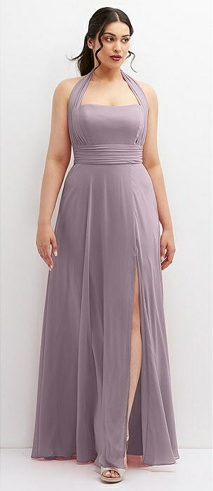 Shirred Skirt Jewel Neck Halter Dress with Front Slit in lilac dusk