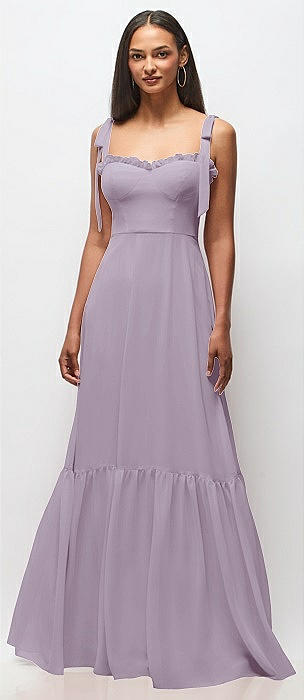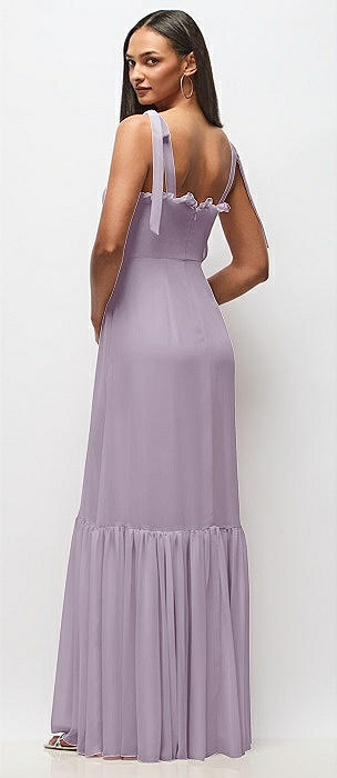 Tie-Shoulder Bustier Bodice Ruffle-Hem Maxi Dress in lilac haze