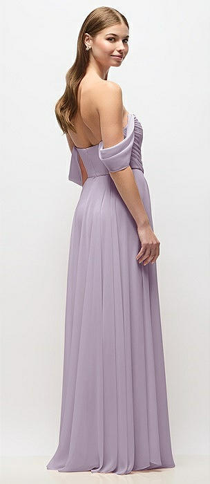 Strapless Chiffon Maxi Dress with Asymmetrical Ruched Drop Waist in lilac haze