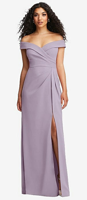 Cuffed Off-the-Shoulder Pleated Faux Wrap Maxi Dress in lilac haze
