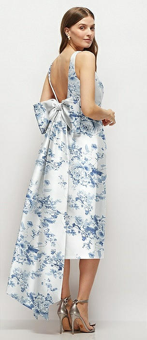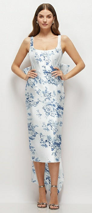 Floral Scoop Neck Corset Satin Midi Dress with Floor-Length Bow Tails in cottage rose larkspur