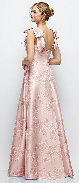 Boned Corset Closed-Back Floral Satin Gown with Full Skirt in bow and blossom print