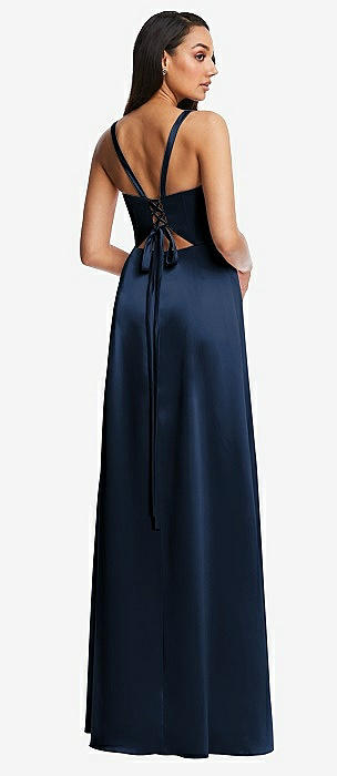 Lace Up Tie-Back Corset Maxi Dress with Front Slit in midnight navy