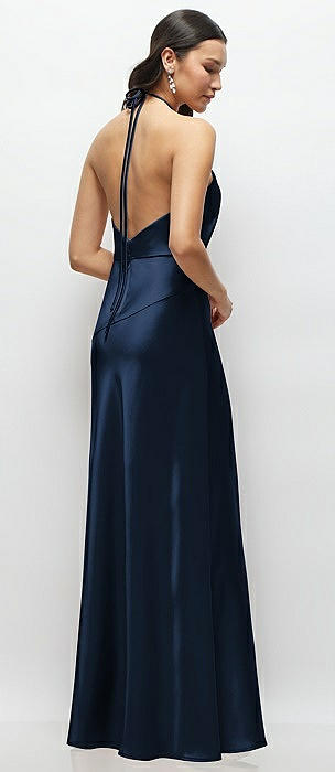 High Halter Tie-Strap Open-Back Satin Maxi Dress in midnight navy
