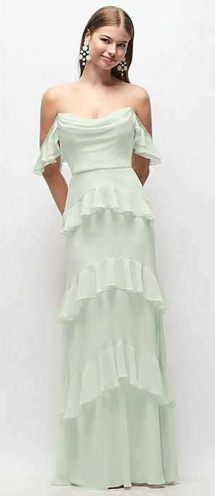 Off-the-Shoulder Cowl Chiffon Tiered Ruffle Maxi Dress with Convertible Ruffle Straps in mint green