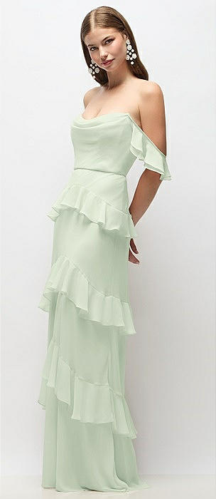 Off-the-Shoulder Cowl Chiffon Tiered Ruffle Maxi Dress with Convertible Ruffle Straps in mint green