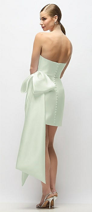 Strapless Pleated Draped Satin Mini Dress with Dramatic Long Tail Bow & Covered Buttons in mint green