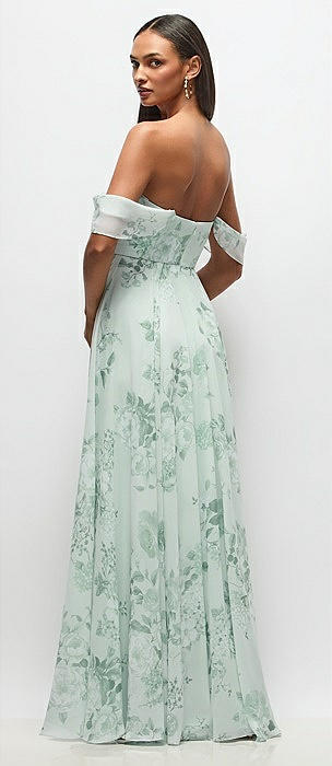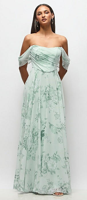 Chiffon Corset Maxi Dress with Removable Off-the-Shoulder Swags in mint green floral