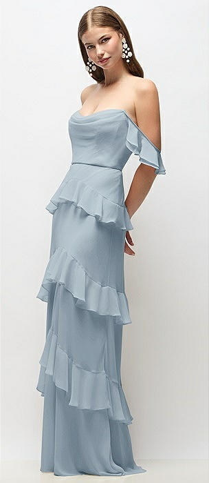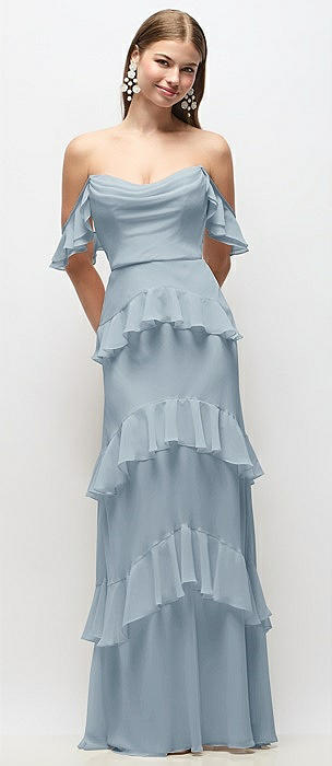 Off-the-Shoulder Cowl Chiffon Tiered Ruffle Maxi Dress with Convertible Ruffle Straps in mist