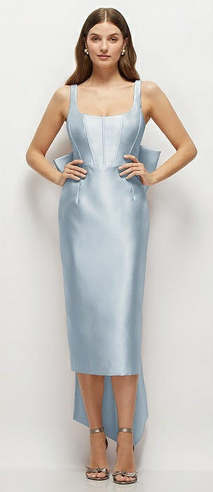 Scoop Neck Corset Satin Midi Dress with Floor-Length Bow Tails in mist