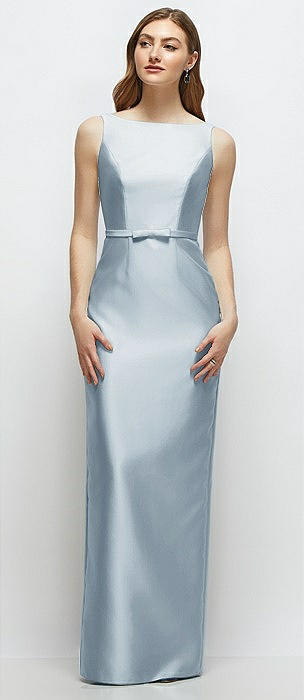 Bateau Neck Satin Column Dress with Bow-Trimmed Skinny Belt in mist