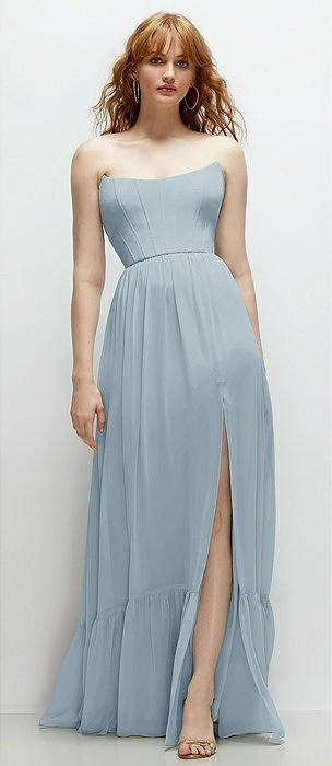 Strapless Cat-Eye Corset Maxi Dress with Ruffle Hem A-Line Skirt in mist