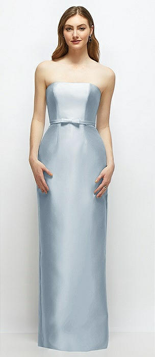 Strapless Satin Column Dress with Bow-Trimmed Skinny Belt in mist