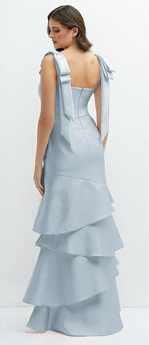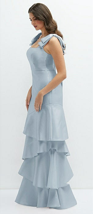 Bow-Shoulder Satin Maxi Dress with Asymmetrical Tiered Skirt in mist
