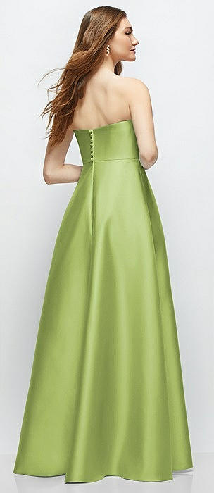 Strapless Satin Gown with Full Skirt and Covered Buttons at Back in mojito