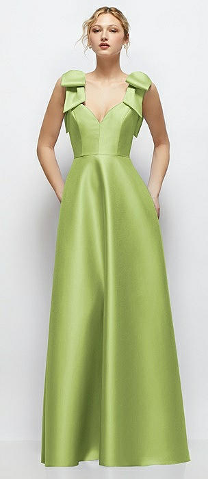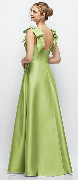 Basque-Neck Satin Column Maxi Dress with Off-the-Shoulder Bows in mojito