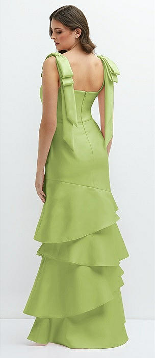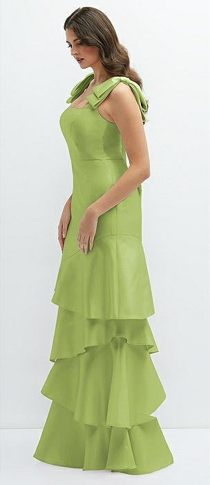 Bow-Shoulder Satin Maxi Dress with Asymmetrical Tiered Skirt in mojito