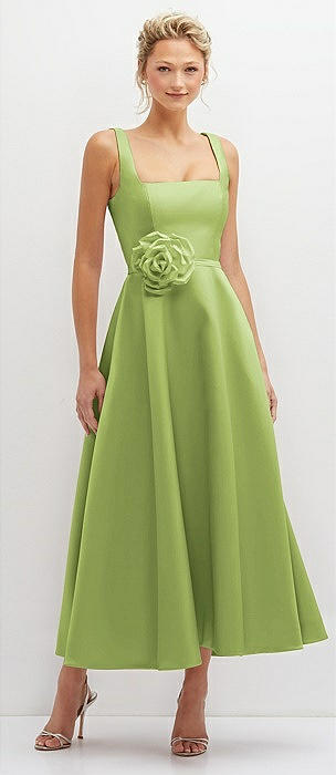 Square Neck Satin Midi Dress with Full Skirt & Flower Sash in mojito
