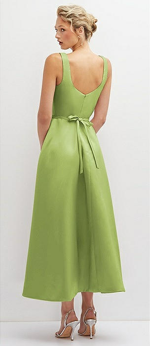 Square Neck Satin Midi Dress with Full Skirt & Pockets in mojito