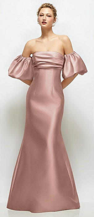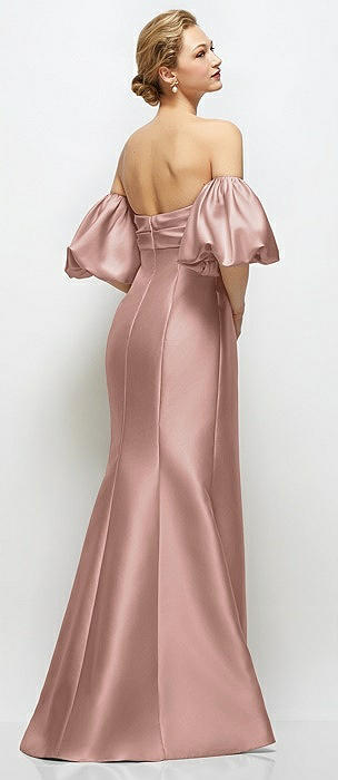 Off-the-Shoulder Puff Sleeve Satin Maxi Dress with Flared Skirt in neu nude