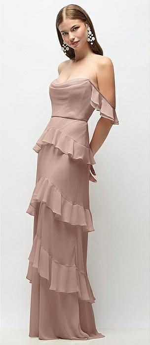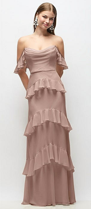 Off-the-Shoulder Cowl Chiffon Tiered Ruffle Maxi Dress with Convertible Ruffle Straps in neu nude