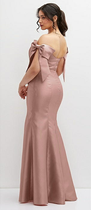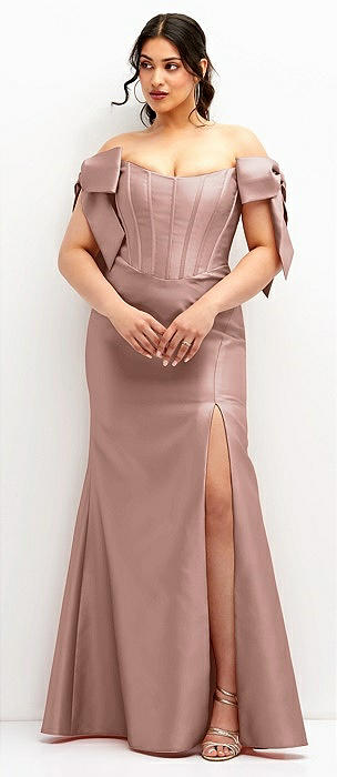 Off-the-Shoulder Bow Satin Corset Dress with Fit and Flare Skirt in neu nude