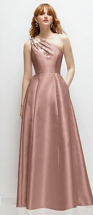 One-Shoulder Full A-Line Satin Gown with Handworked Floral Appliqué in neu nude