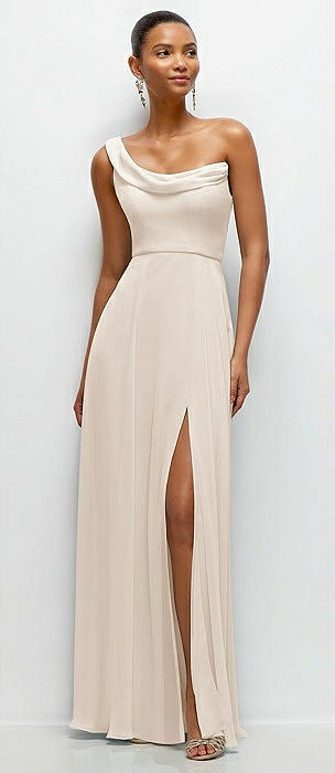 Chiffon One-Shoulder Maxi Dress with Draped Cowl Neckline in oat