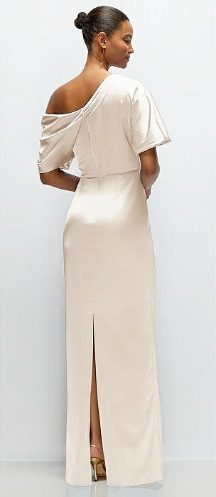 Asymmetrical Off-the-Shoulder Pleated Satin Maxi Dress in oat