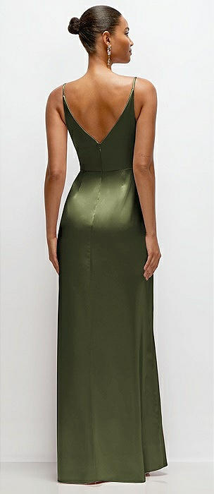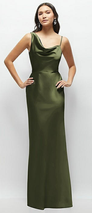 Cowl Neck Satin Maxi Dress with Adjustable Spaghetti Straps in olive green