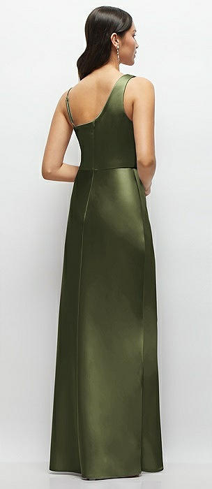 Satin Twist Bandeau One-Shoulder Bias Maxi Dress in olive green
