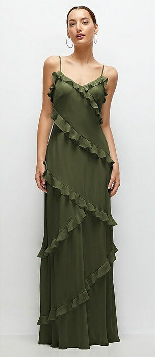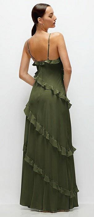 Asymmetrical Ruffle Chiffon Bias Slip Maxi Dress in olive green