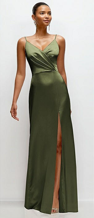 Pleated Faux Wrap Satin Maxi Dress with Adjustable Spaghetti Straps in olive green