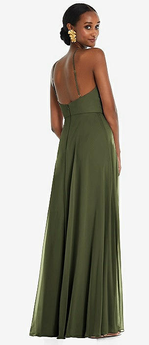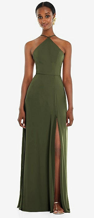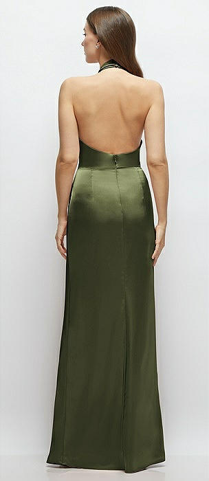 High Halter Tie-Strap Open-Back Satin Maxi Dress in olive green
