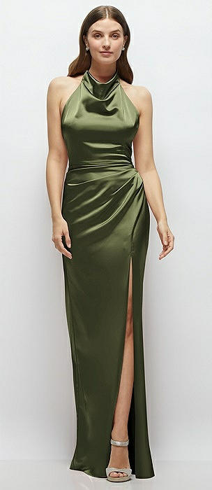 Cowl Halter Open-Back Satin Maxi Dress in olive green
