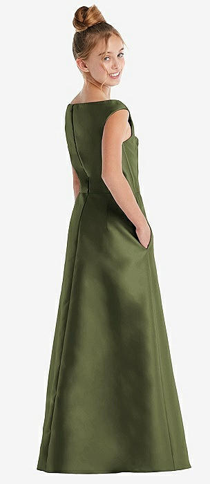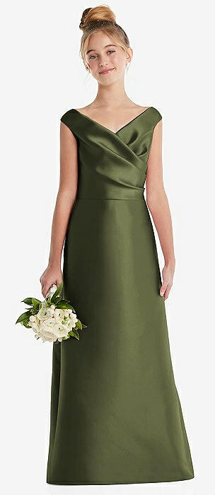 Off-the-Shoulder Draped Wrap Satin Junior Bridesmaid Dress in olive green
