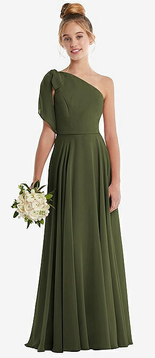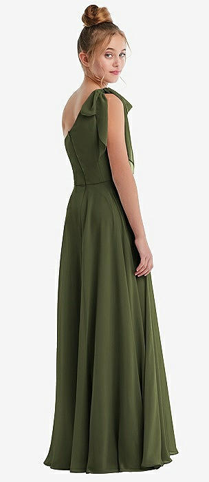 One-Shoulder Scarf Bow Chiffon Junior Bridesmaid Dress in olive green
